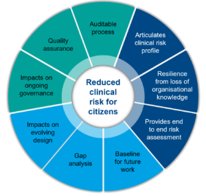 Baseline for future work/gap analysis/Impact on evolving design – a comprehensive end to end clinical risk assessment gives us the opportunity to identify hazards, causes and potential controls. Identifying areas that may benefit from further development can impact on the evolving design of the solution and feed improvement plans, ensuring that the clinical risk is reduced as low as reasonably possible.
